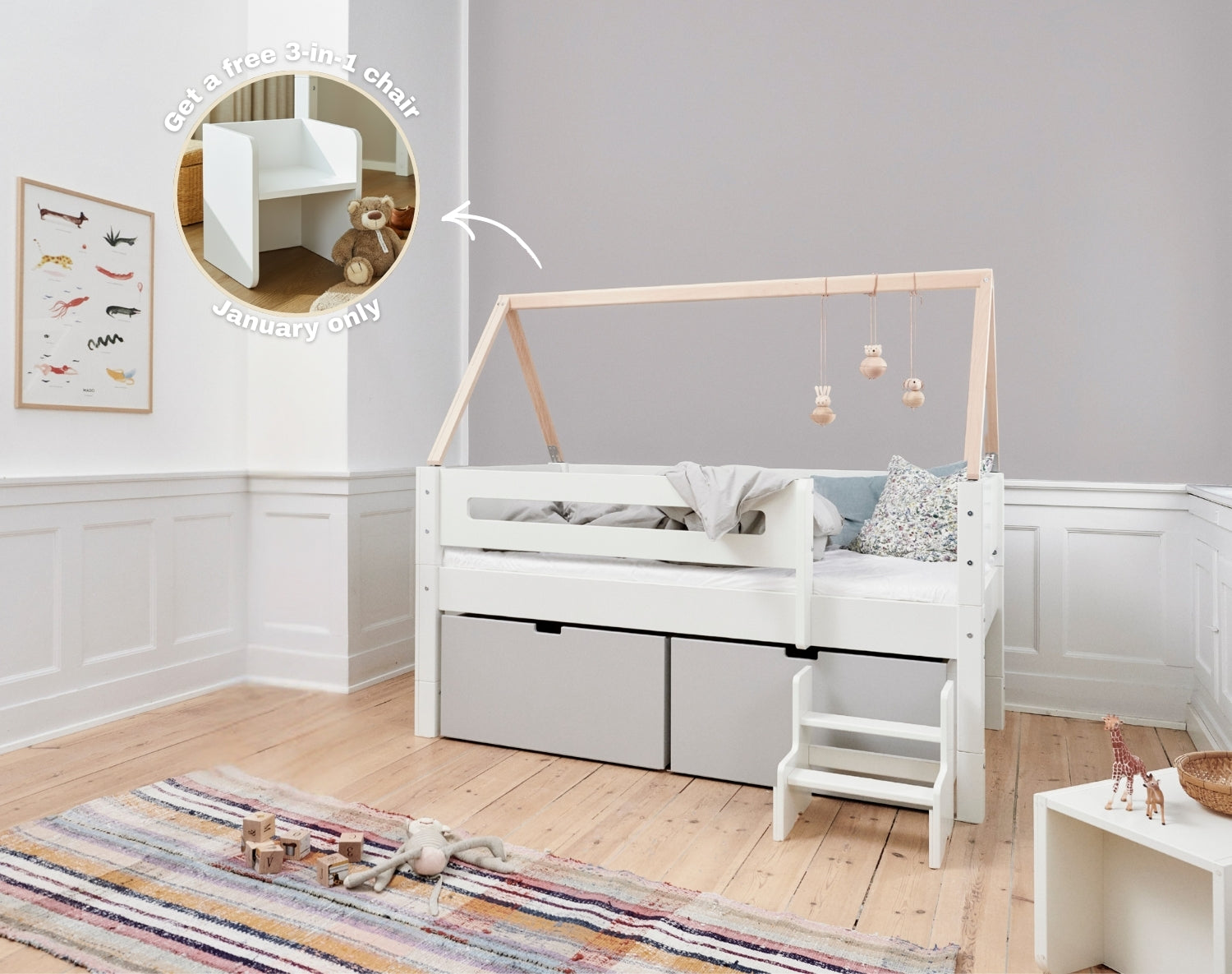 When the child's needs change, the bed changes with it. From low beds to semi-high beds, to high beds and bunk beds – always created for play, security and everyday life.