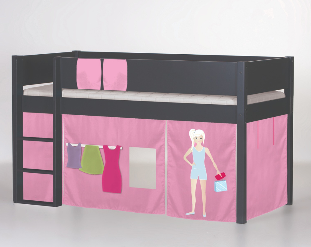 The curtain is designed in pink with dolls. We have this curtain for the 200 cm beds. The curtain comes with velcro, you put it under the bed, and then the curtain is attached to the velcro strip.