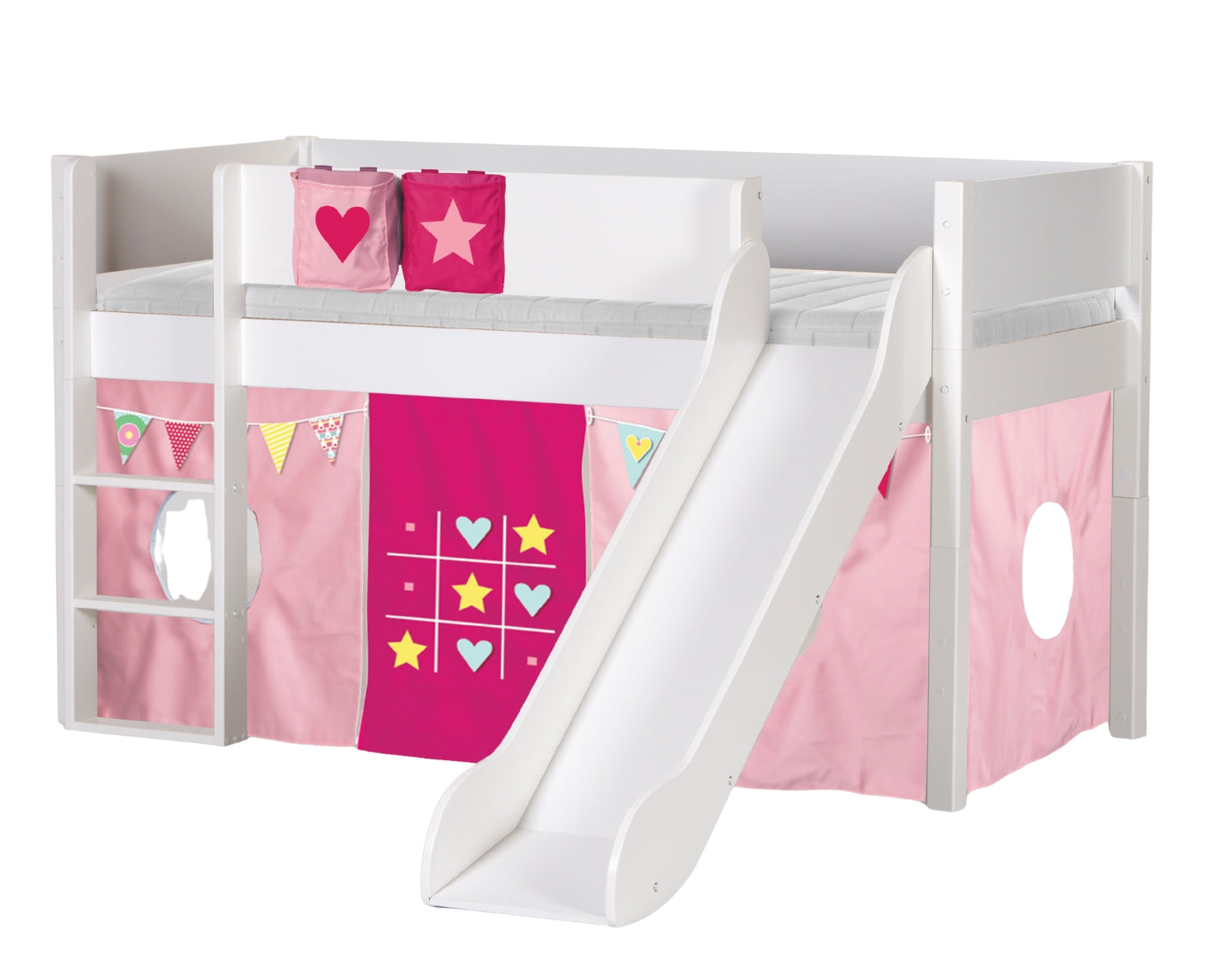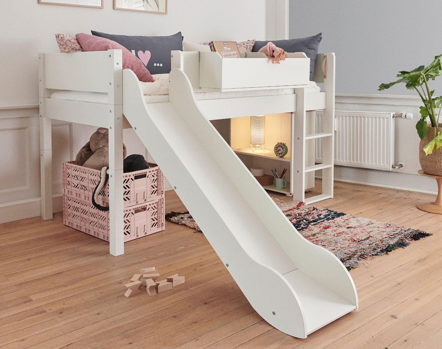 When the day starts with a ride down the slide, the morning routine becomes a game. And in the evening it is easy to find peace again – safely surrounded by high bed rails, which create a framed and safe sleeping place. Under the bed, a small free space is created for cave building, role-playing or just calmly immersing yourself in books and teddy bears.