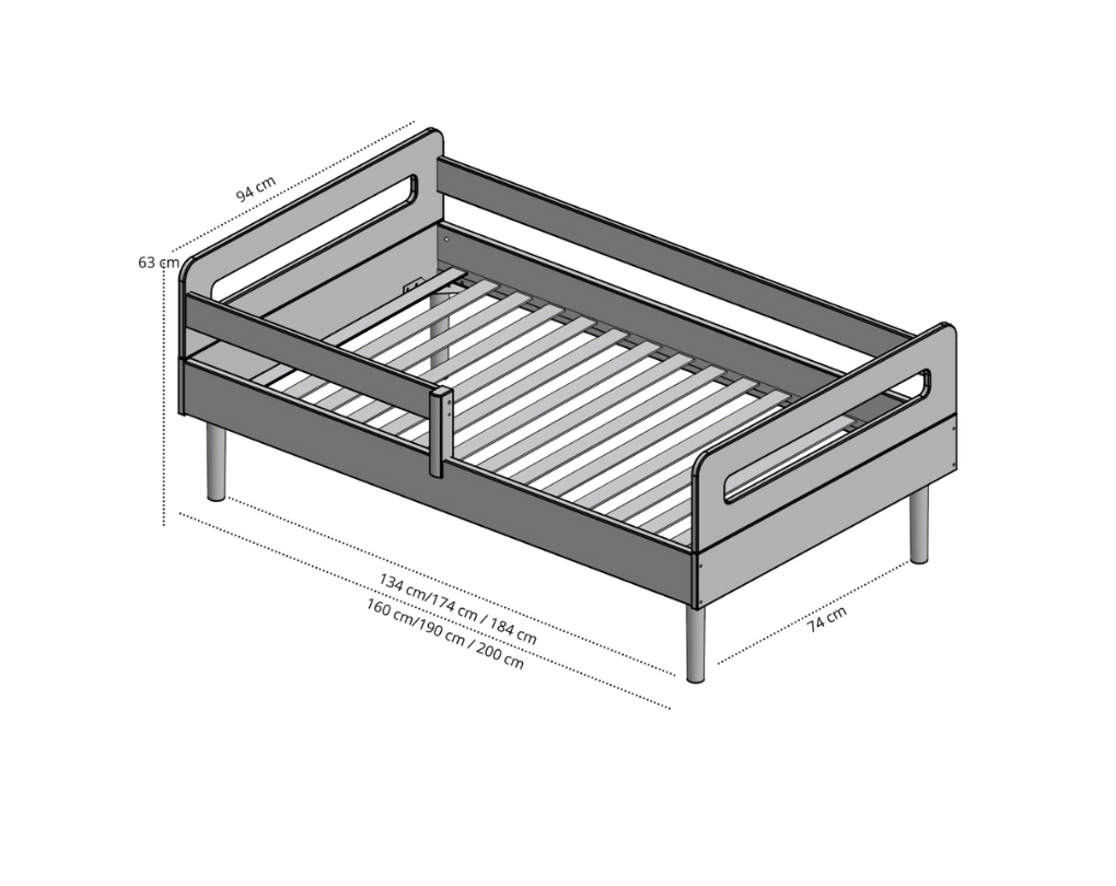 The bed comes with sturdy natural beech legs and is available in a beautiful selection of colors. Choose between 160 cm, 190 cm or 200 cm length - depending on the child's age and needs.