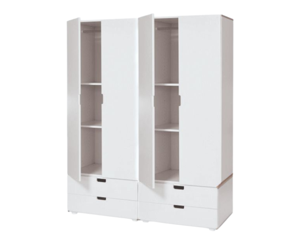 There is a clothes rail in both tall cabinets and two shelves. You can add more shelves if you want.