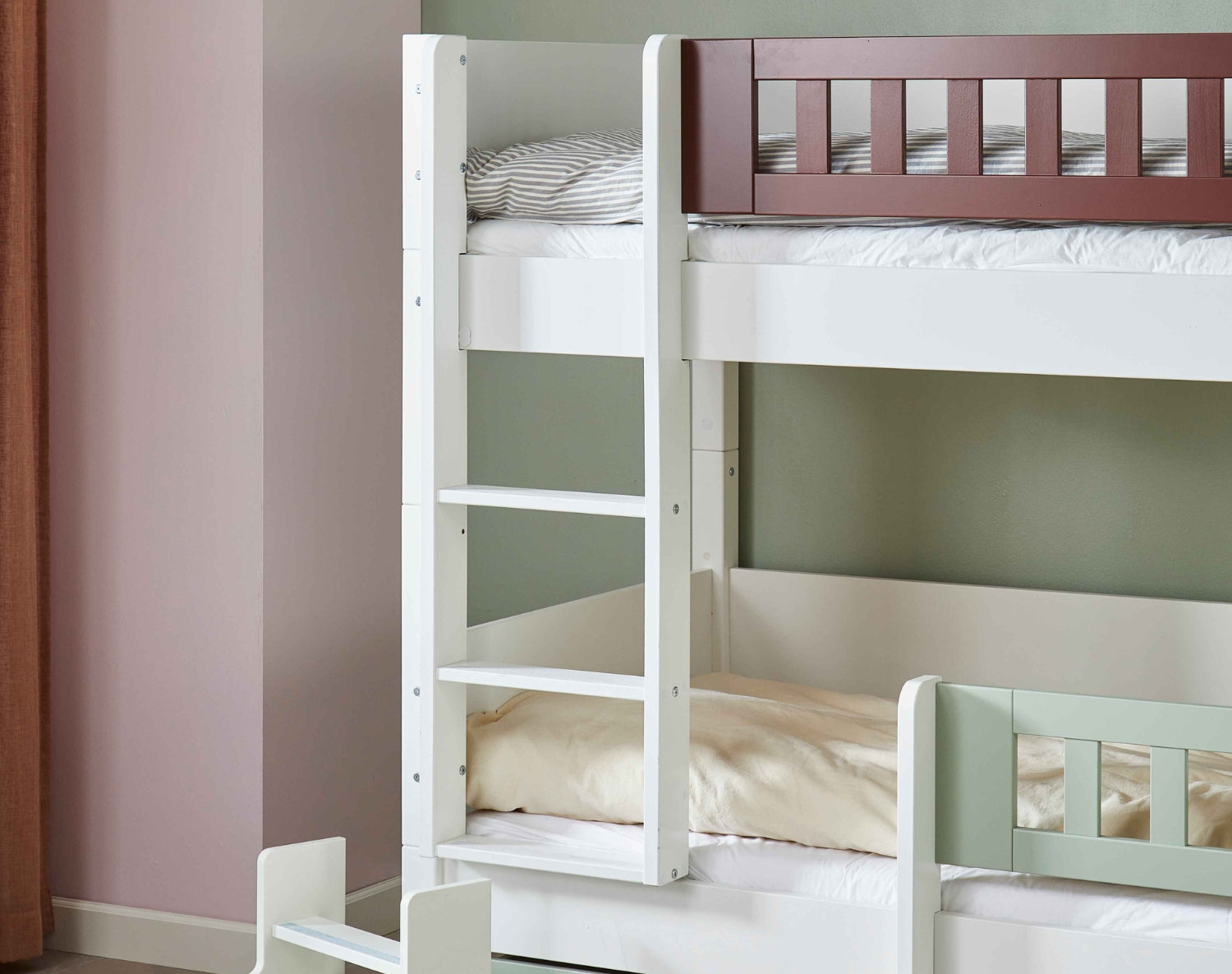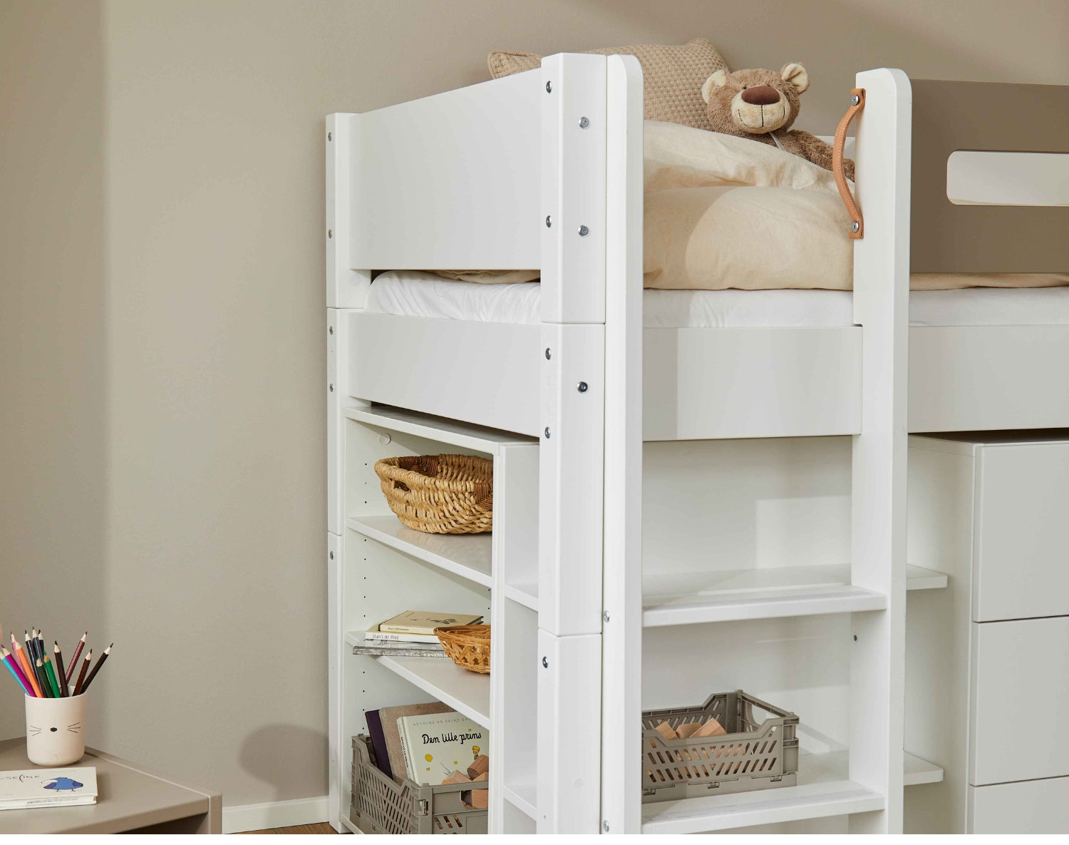 With this versatile ladder, you can easily convert a mid-height bed into a space-saving bunk bed when two children need to sleep in the same room. You don't need to buy a new ladder - the same model fits perfectly into both bed solutions. This makes the transition easy, economical and sustainable.