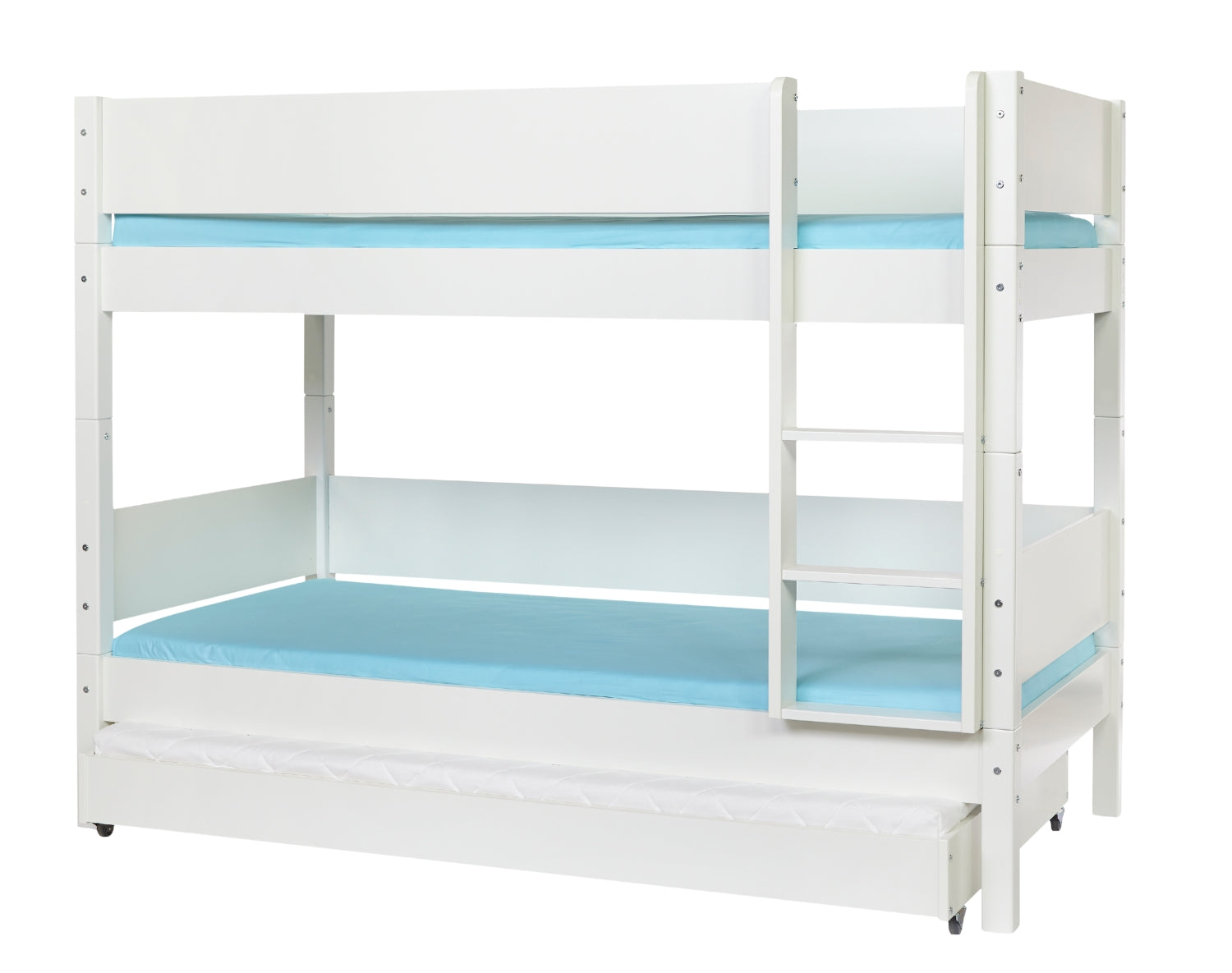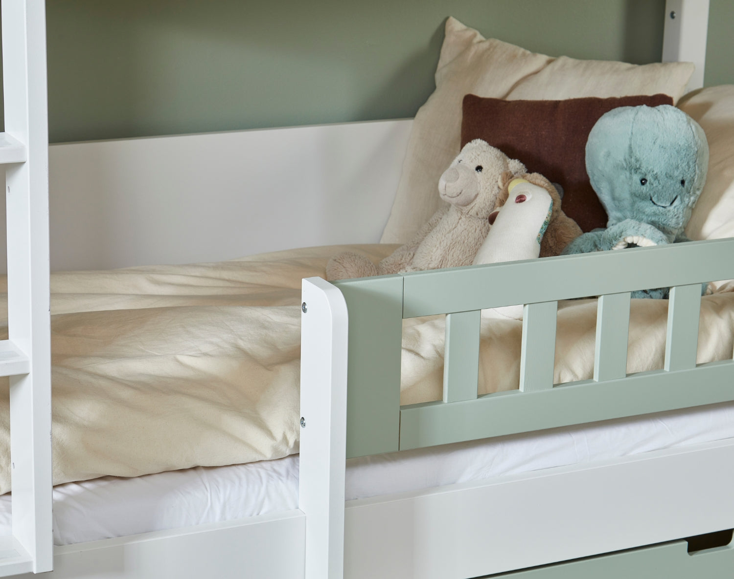The bed can easily be divided into two single beds or transformed into a single bed and a semi-high bed. You can also build on it and transform it into, for example, a high bed or a new bunk bed combination. One piece of furniture - many possibilities. A space-saving solution that grows with the child. Of course, a bed rail can be added to the lower bunk, so that even the little siblings can sleep safely and securely.