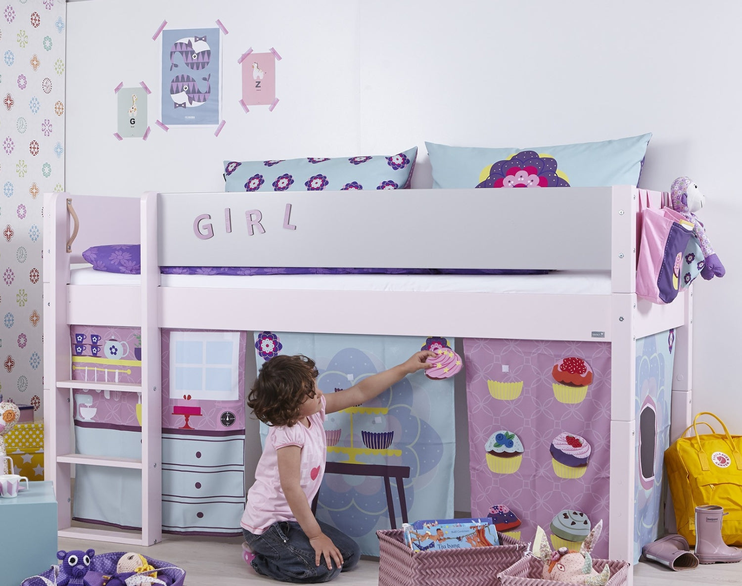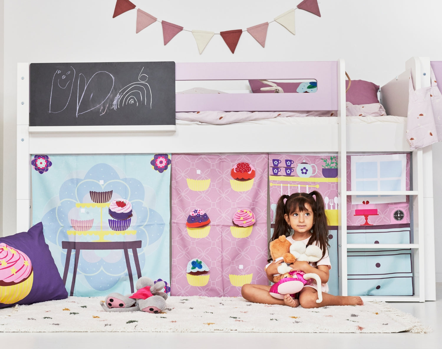 Here your child can open their own little bakery, host a tea party for the teddy bears or find peace in a safe and magical corner. The curtain can be combined with optional bed pockets and cushions that match the Cup Cake theme perfectly - or you can mix and match for a unique and personal expression that your child can help create.