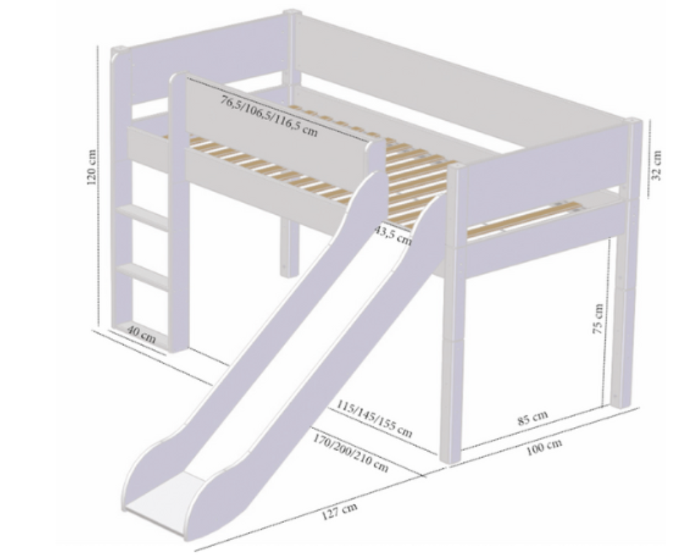 The slide is available for bed lengths of 200 cm, 190 cm and 160 cm, so you can easily find the size that fits your child's bed.